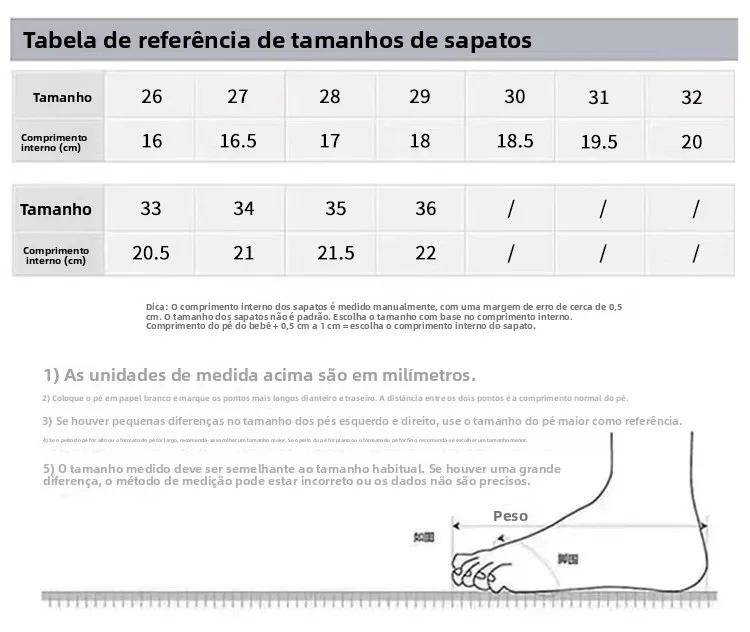 • Tamanho 26: 160 cm (recomendamos adicionar 1 cm ao comprimento do pé do seu bebê para melhor ajuste)