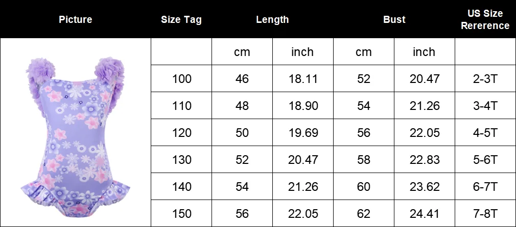 Tamanho infantil dos EUA: {2-3t (100), 3-4t (110), 4-5t (120), 5-6t (130), 7-8t (140) e 9-10t (150).